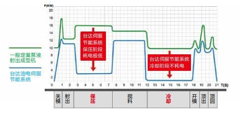 臺達油電伺服節(jié)能系統(tǒng),能精確控制整個注塑過程所需的壓力與流量,消除高壓節(jié)流的能源損耗,達到節(jié)能省電的效果,同時降低系統(tǒng)油溫,是一舉數(shù)得的系統(tǒng),節(jié)能率高達70%,平均節(jié)能率30%以上。